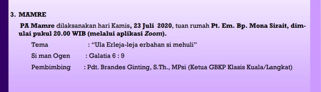 Adi sipepayo i bas 1 Petrus 1:17b “erdandanken si e pakeken kesempaten si lit guna permuliaken Dibata, kidekah kam nggeluh denga i doni enda” arah kata Dibata enda lit sada kesempaten erbahan si mehuli i bas doni enda. Enda me pe isingetken Paulus i bas ogenta enda gelah tetap erbahan simehuli aminna pe situasi paksa sie lit pengaruh-pengaruh ajaren si erbahanca perpulungen e la erbahan Simehuli, ntah si la ngena ate Dibata, gelah perpulungen nggeluh erbana-bana dingen pecah. Kata enda gundari seh man banta khusus selaku Mamre, bapa ras imam itengah jabu, kita ituntut gelah tetap erbahan si mehuli i bas geluhta, man keluarga bagepe nan kalak sideban aminna pe lit pengaruh ras ajaren si ngajuk kita gelah ula erbahan simehuli. Ula bere kesempaten i bas pusuhta guna ipengaruhi ajaren si papak, sebab pengajaren e rehna i bas iblis nari, bagi nina i bas Epesus 4:27 “Ula bere kesempaten man si iblis”, gelah ula lit kesempaten e man iblis, sirembakkenlah dirita tetap man Dibata alu kiniteken bagepe dahiken dahin Dibata bas geluhta.