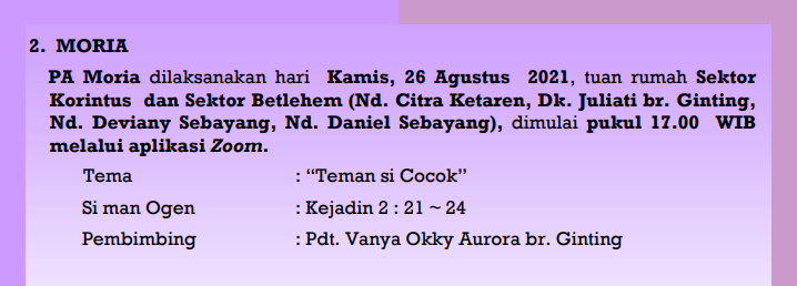 Teman i bas kamus besar bahasa Indonesia eme ‘kawan, sahabat, orang yang besama-sama bekerja, berbuat, berjalan’. Teman hidup (suami, isteri, pasangan) ntah pe teman sejawat, sada ingan dahin. Kuga kin teman si iarapken kita? Tentuna teman si setia; tupung kita i bas gulut ukur, ceda ate entah meriah ukur, nggit ia megiken isi pusuhta, nampati ras sidebanna. Teman e seh kal perluna bas geluh enda, banci sibayangken dikune kita la erteman, sisada si akap banta. Emaka lit nge belas-belasta ‘teman paksa meriah banci nterem tapi teman i bas paksa susah ntah tangis labo piga. Nggo nge banci si kataken maka perbulangenta, teman geluhta e jadi teman si cocok man banta? Bageme i bas HUT Mamre tahun enda, Moria iajuk ngidah tole teman geluhna, teman si cocok man bana. Ibabai kita arah PA wari enda niksiki tole kuga kin teman si cocok man banta Moria selaku ndehara.