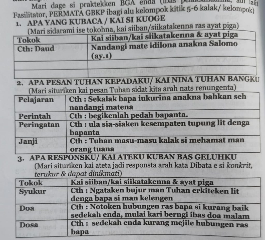 Mari dage si praktekken BGA enda(ibas pelaksanaanna, adi lalit Fasilitator, PERMATA GBKP ibagi alu kelompok kitik 5-6 kalak/kelompok)